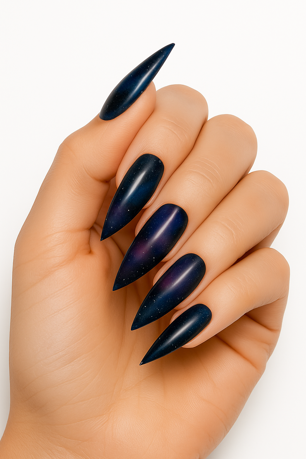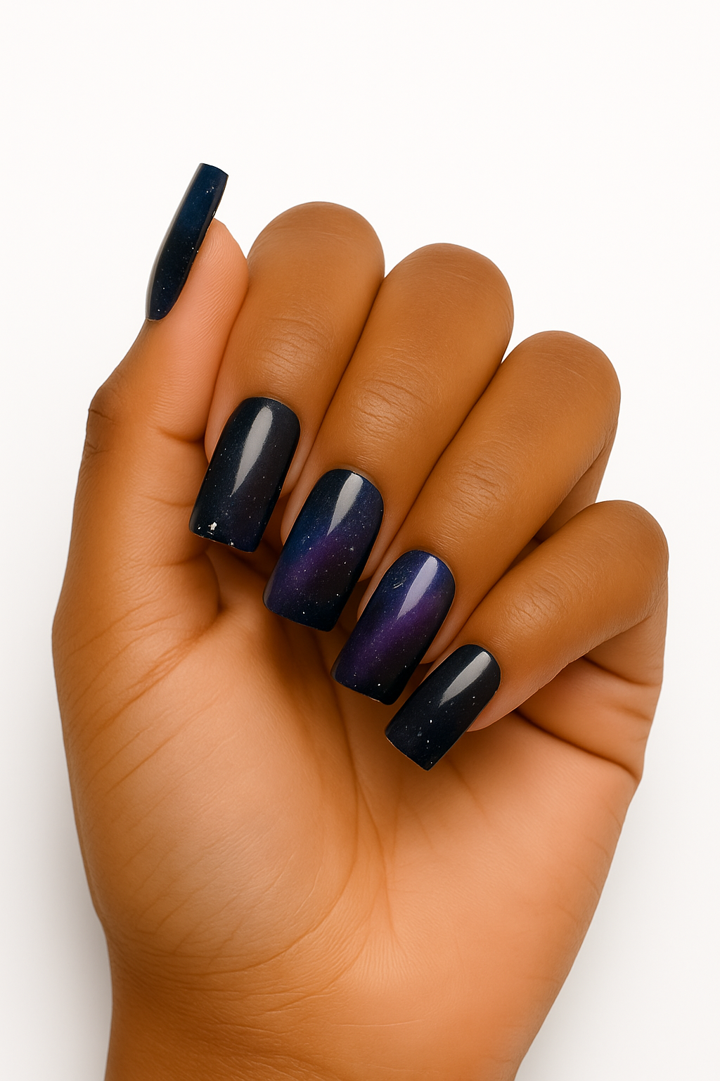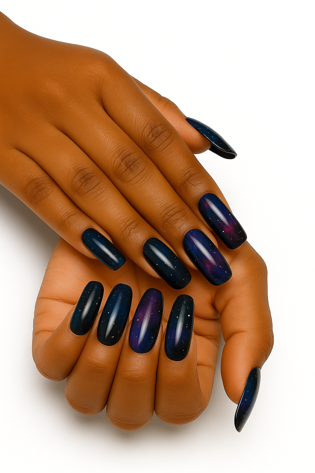 Color Scheme: Rich black, midnight blue, and nebula purple swirls, each nail is speckled with tiny star-like flecks that sparkle like distant galaxies.